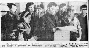 Мастер В.Р. Ушенкин проводит беседу с рабочими по материалам XXV съезда КПСС.