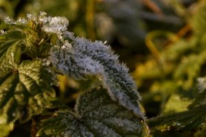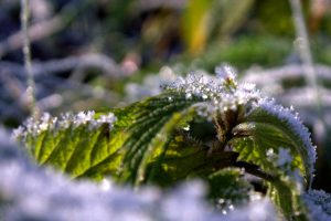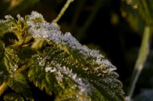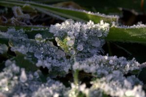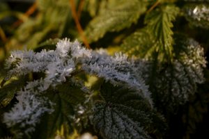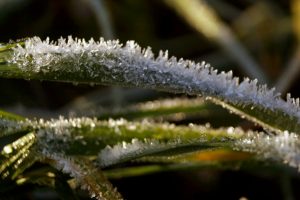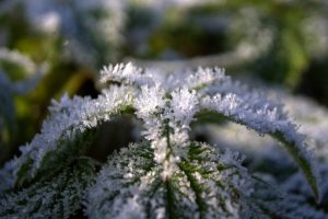 Но выйдя вчера днем после крепкого ночного заморозка и дойдя до замусоренного сорняком газончика неподалеку от дома, я буквально обомлел. Полуденное солнце только-только бросило свои лучи на этот клочок земли. Еще не растаяли от слабого осеннего солнечного тепла и не посыпались от ног прохожих иглы ночного инея. Низкое в это время года солнце идеально подсвечивало колючки ледяных кактусов, искрами сверкавших в еще зеленой траве. Пришлось сбегать за камерой. Не скажу, что Тузик был счастлив, когда я оттащил его с этой полянки. Зато, каков результат!