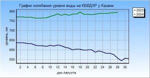 2023 г.: max 644 см (1 августа), min 552 см (29 августа), средний за месяц 601 см