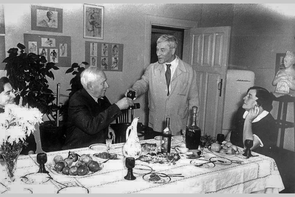 А поводом была фотография. Эта фотография была снята 28 октября 1958, в тот день, когда Пастернак узнал, что получил Нобелевскую премию. Было чудесное застолье, пили вино, угощались тбилисскими фруктами, и, смеясь, обсуждали, что нужно шить фрак.. А через 10 минут в этот счастливый мир, запечатленный на фото, войдет Федин и скажет, что Пастернак должен прийти на дачу к Поликарпову, который объявит ему, что по решению советского правительства он должен отказаться от премии. http://svidetel.su/audio/1806