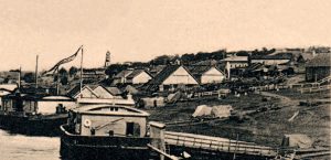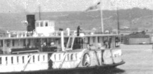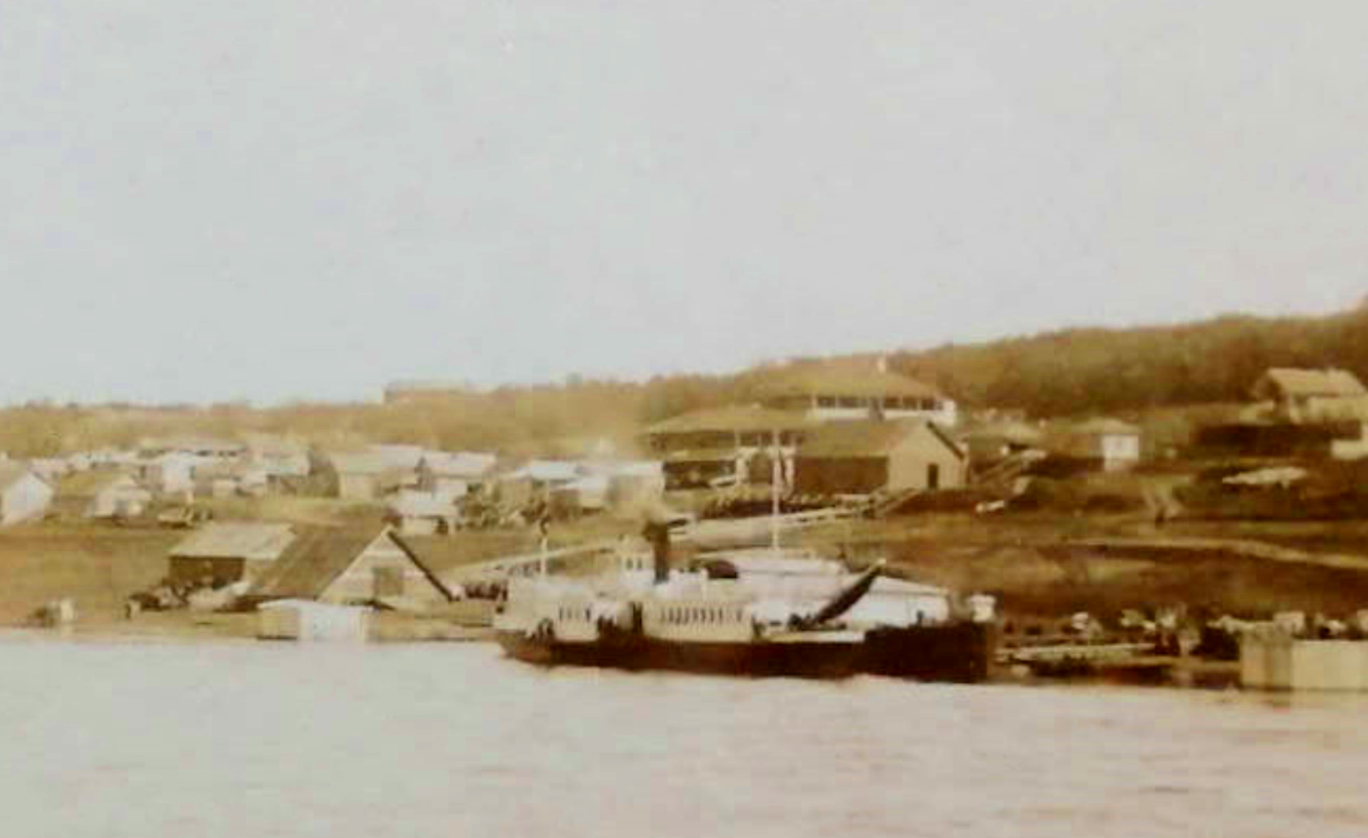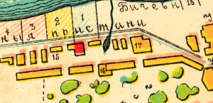 Скан сделан в разрешении 300 dpi и я попросил музей предоставить мне скан с разрешением 1200 dpi как всего фото, так и отдельного его участка с названием пристани и текстом на вывеске — была надежда прочесть текст при большем разрешении скана. Увы — получив 15 ноября скан и часть фото в разрешении 1200 dpi я не прочёл даже название нашей пристани (кликабелен):