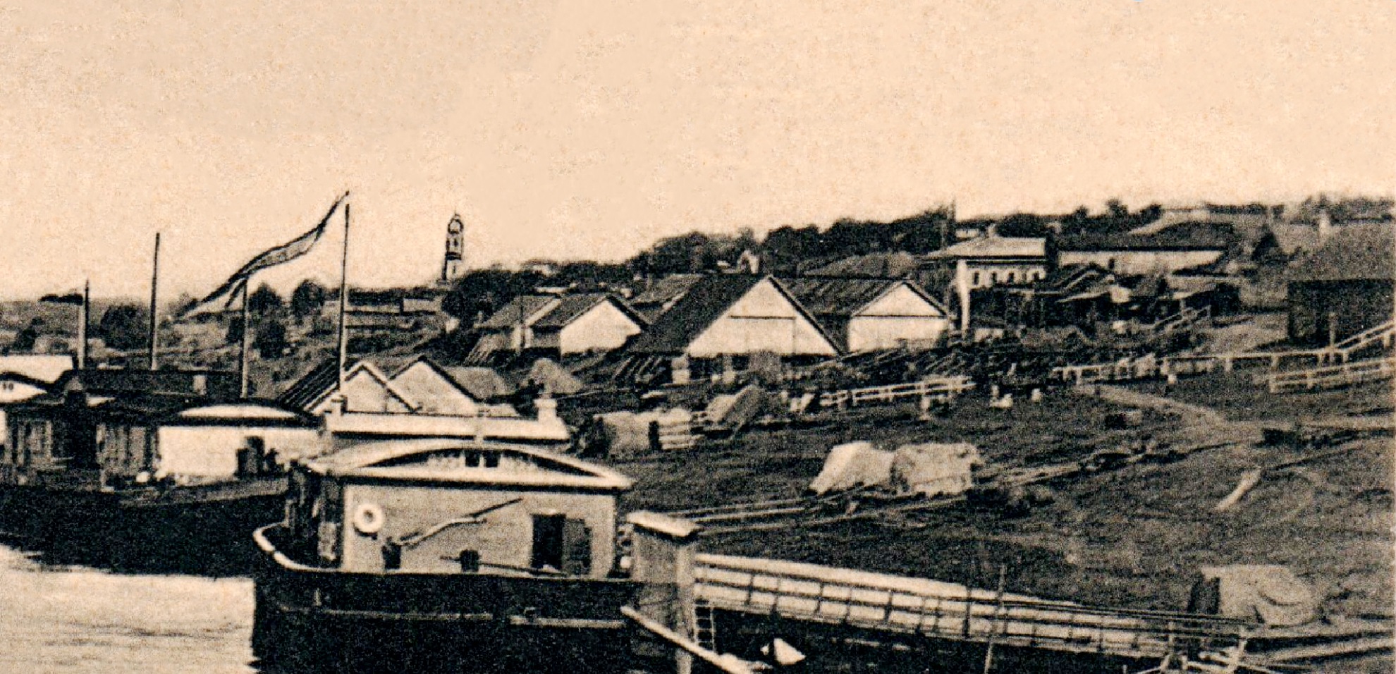 И последняя фотография Чистополя, которую я хотел бы привести, точнее — хотя подпись в ней стоит «Кама. Пристань в Чистополе» (ссылка-2), но это явно не наш город, предлагаю всем убедиться в этом на основе вышеприведённых хлебной, лесной и пароходных пристаней, я такой анализ сделал и могу «по полочкам» расписать мои аргументы, но пока сейчас этого делать не буду: