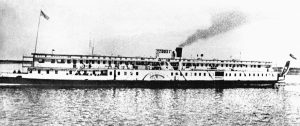 а правее — возможно пароход «Парижская Коммуна» и далее, ближе к косе — теплоходы «Севан» и «Радищев»:
