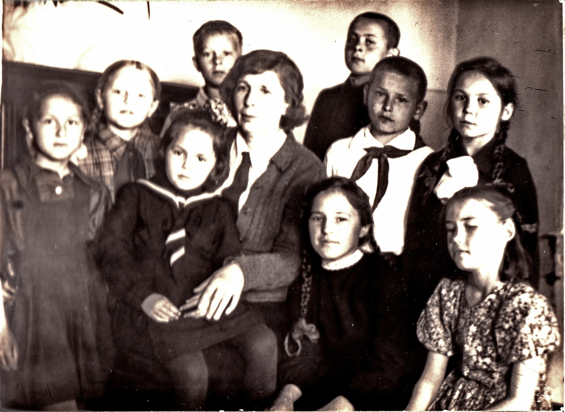 На фото 1947 года — самые первые ученики и Анна Яновна Зельд — первый директор: