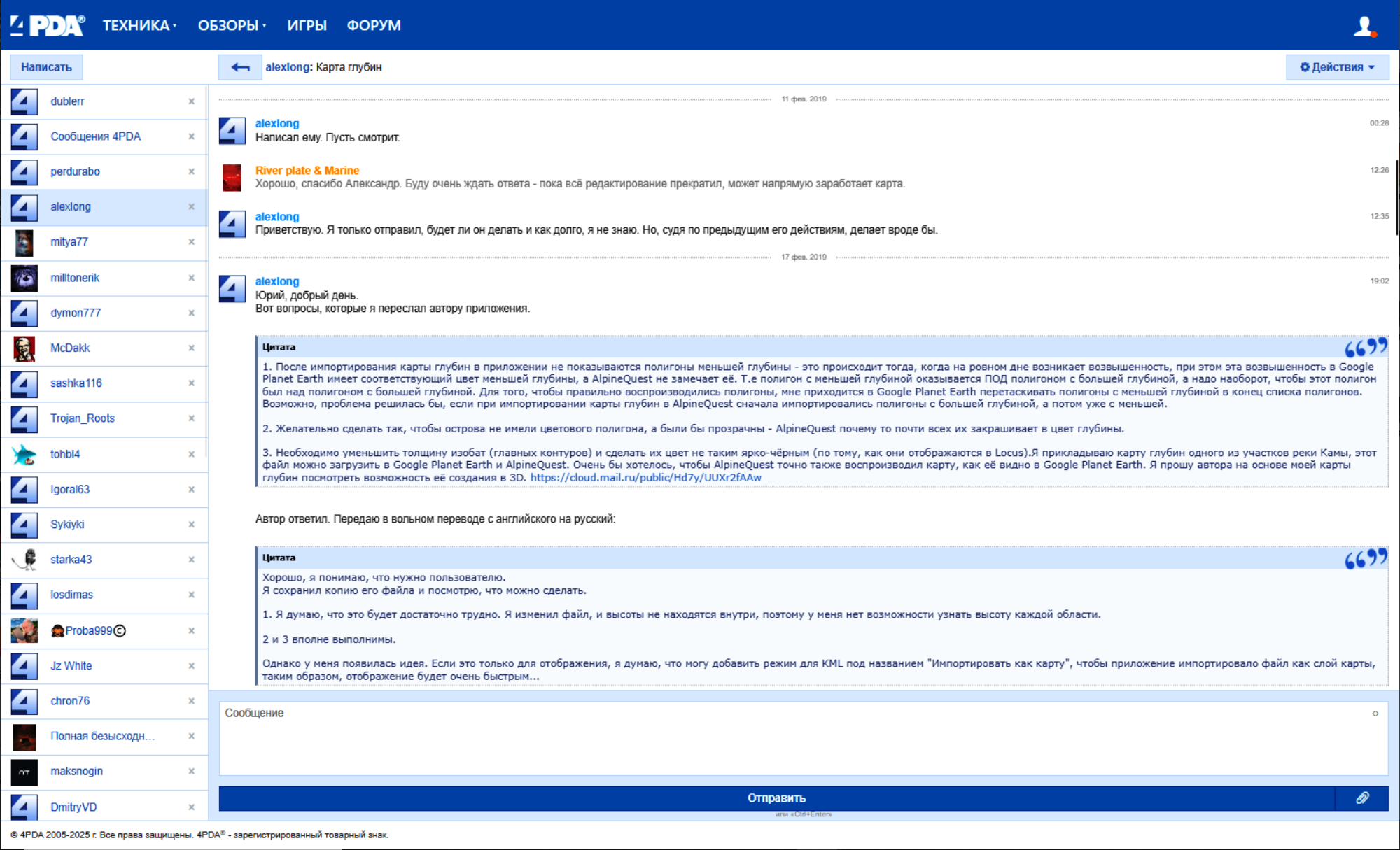 3) 8 и 11 февраля — переписка с куратором темы форума приложения AlpineQuest Off-Road Explorer на сайте 4PDA с просьбой обсудить с разработчиком приложения возможность исправить «баг» работы батиметрической карты в формате KMZ: