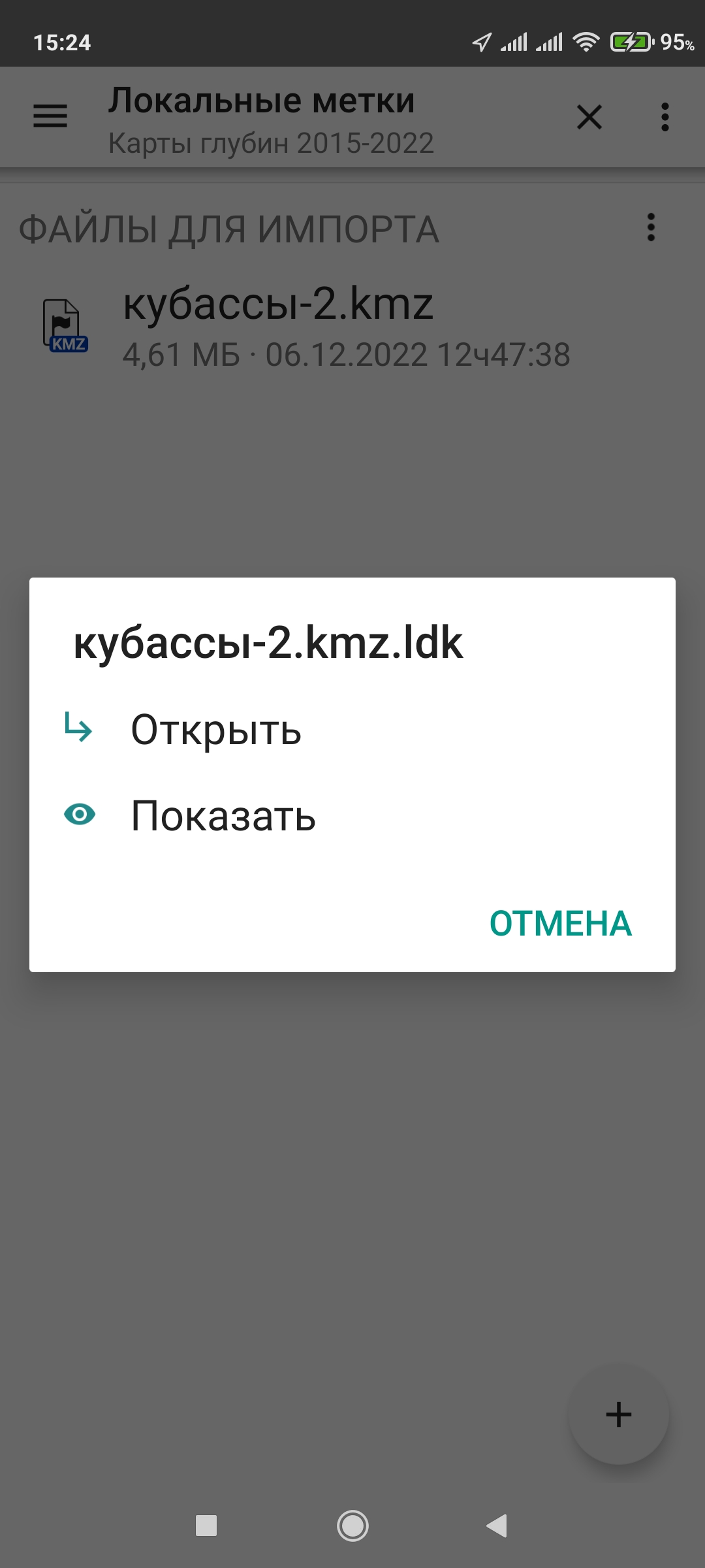 2) 24 февраля — в приложение Locus Map установил ПЕРВУЮ батиметрическую карту в формате KMZ, сделанную на основе лога Александра Сидорова (в середине марта была куплена версия Locus Map Pro). В этом приложении уже тогда были реализованы все мои рыбацкие «хотелки» для карт — русскоязычное меню, поддержка чтения/импорта файлов KMZ (карты глубин!), поддержка чтения/импорта карт в формате RMaps SQLiteDB.