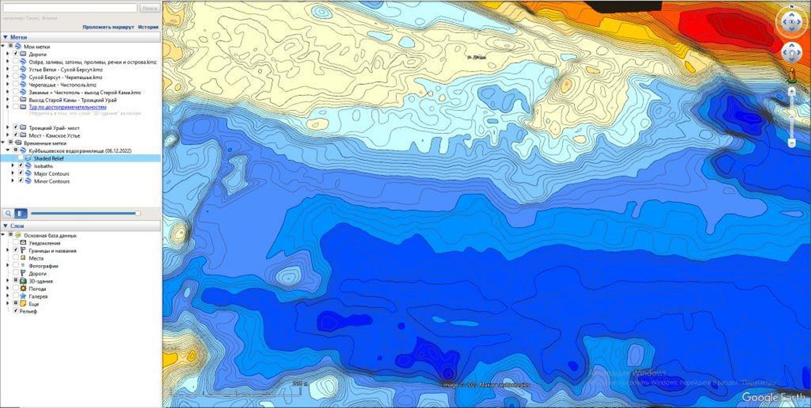 Слой 2 (KMZ) — батиметрическая карта акватории Камы на основе записанных логов эхолотом-картплоттером LOWRANCE: