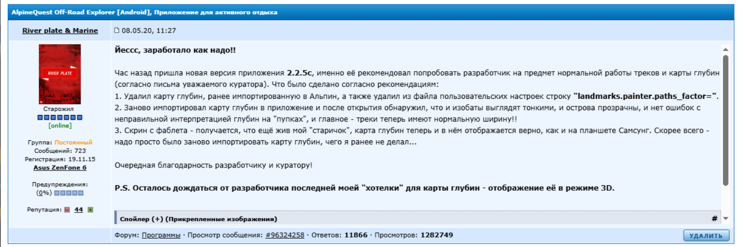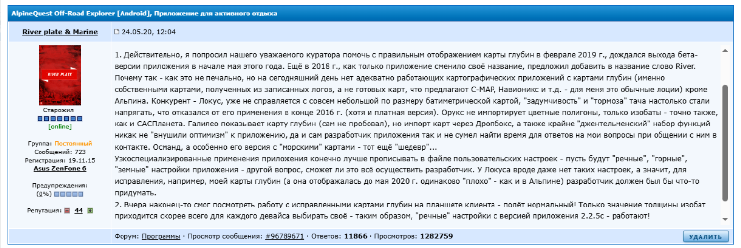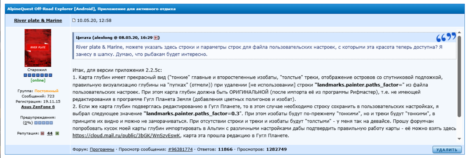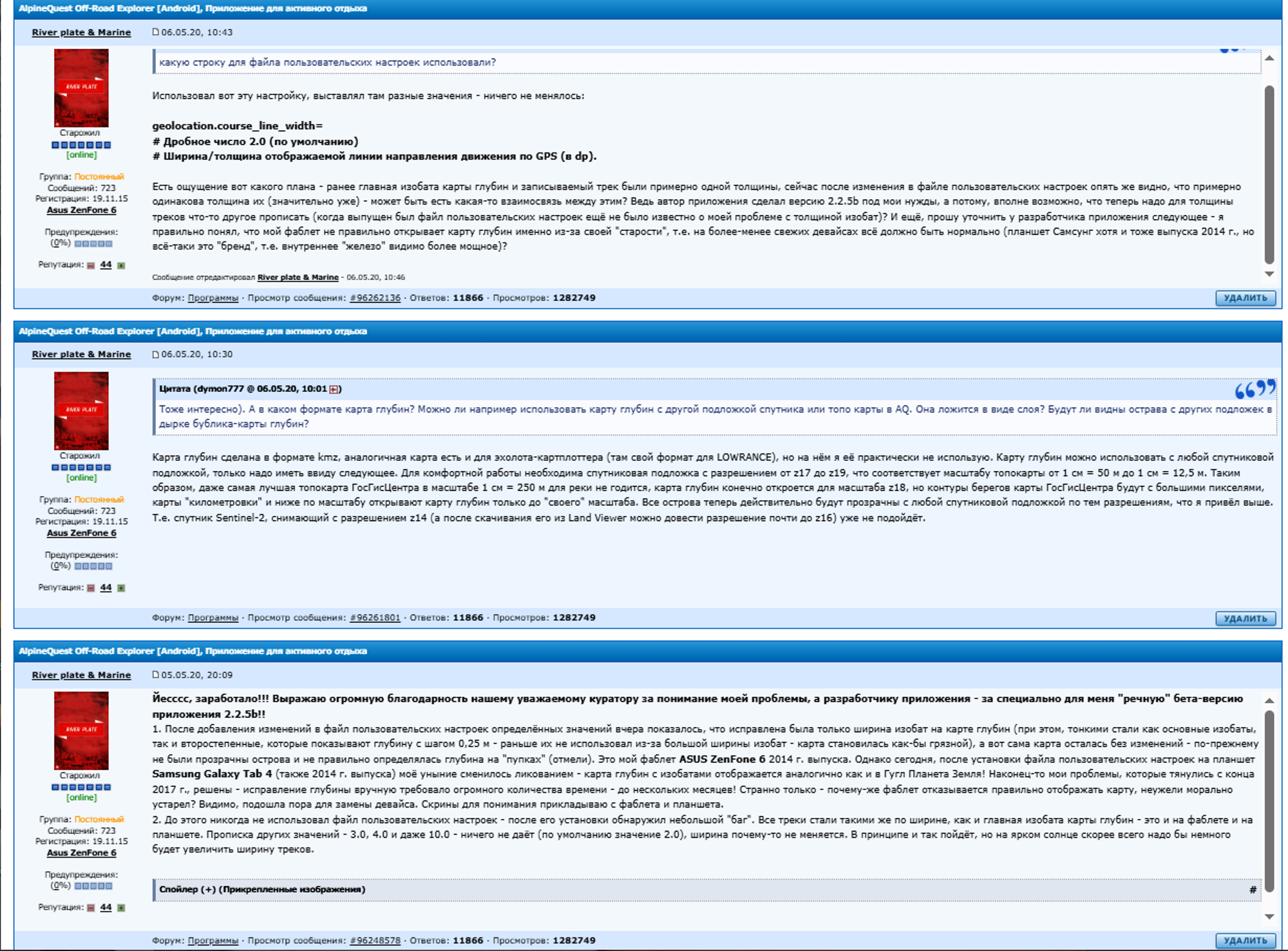 3) 25 апреля — вышла специальная «речная» версия 2.2.5 приложения AlpineQuest Off-Road Explorer, эту версию разработчик приложения сделал по моей просьбе (ждал её с февраля 2019 г.). После изменений значений в файле пользовательских настроек изобаты карты глубин стали «тонкими» (такими, как они видны в Гугл Планете Земля), кроме этого, стали прозрачными острова — теперь цветных полигонов глубины на них нет (видна спутниковая подложка), а также правильно стала отображаться глубина на «пупках». Мои посты в теме форума приложения AlpineQuest Off-Road Explorer на сайте 4PDA по случаю выхода этой версии в мае 2020 г.: