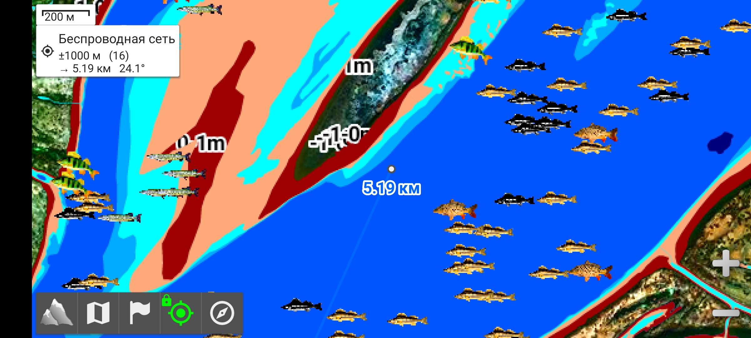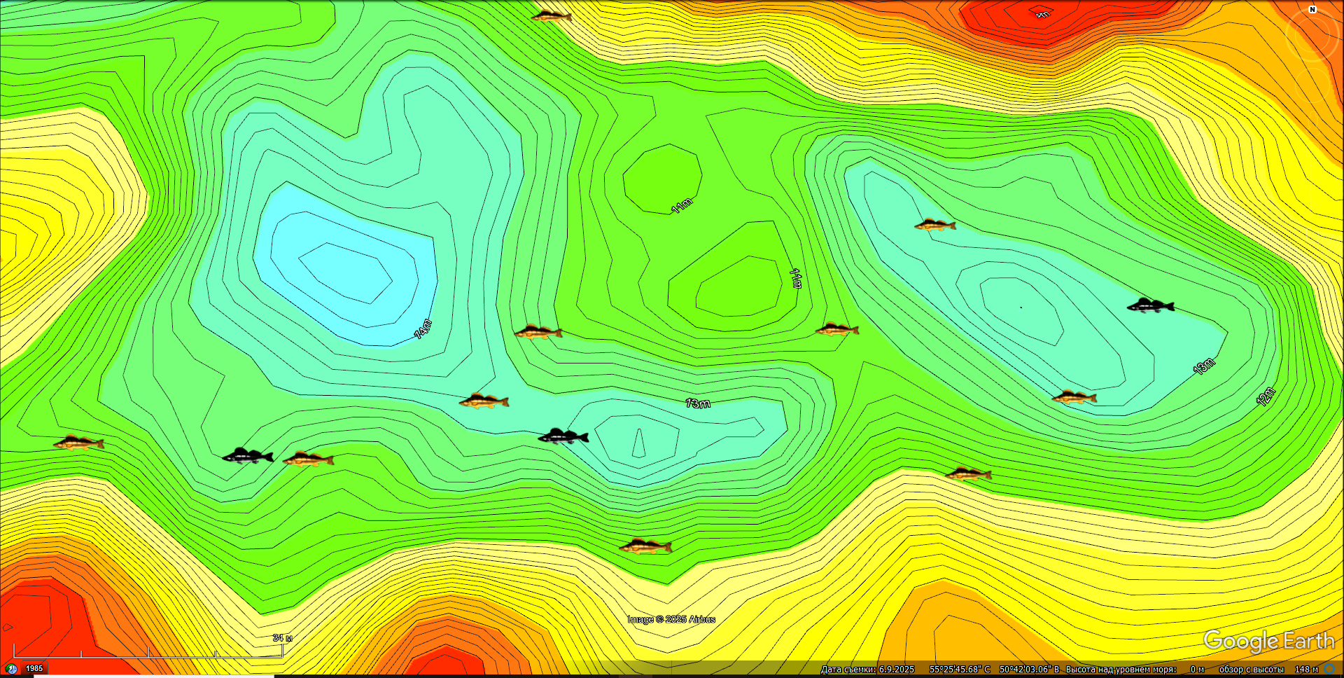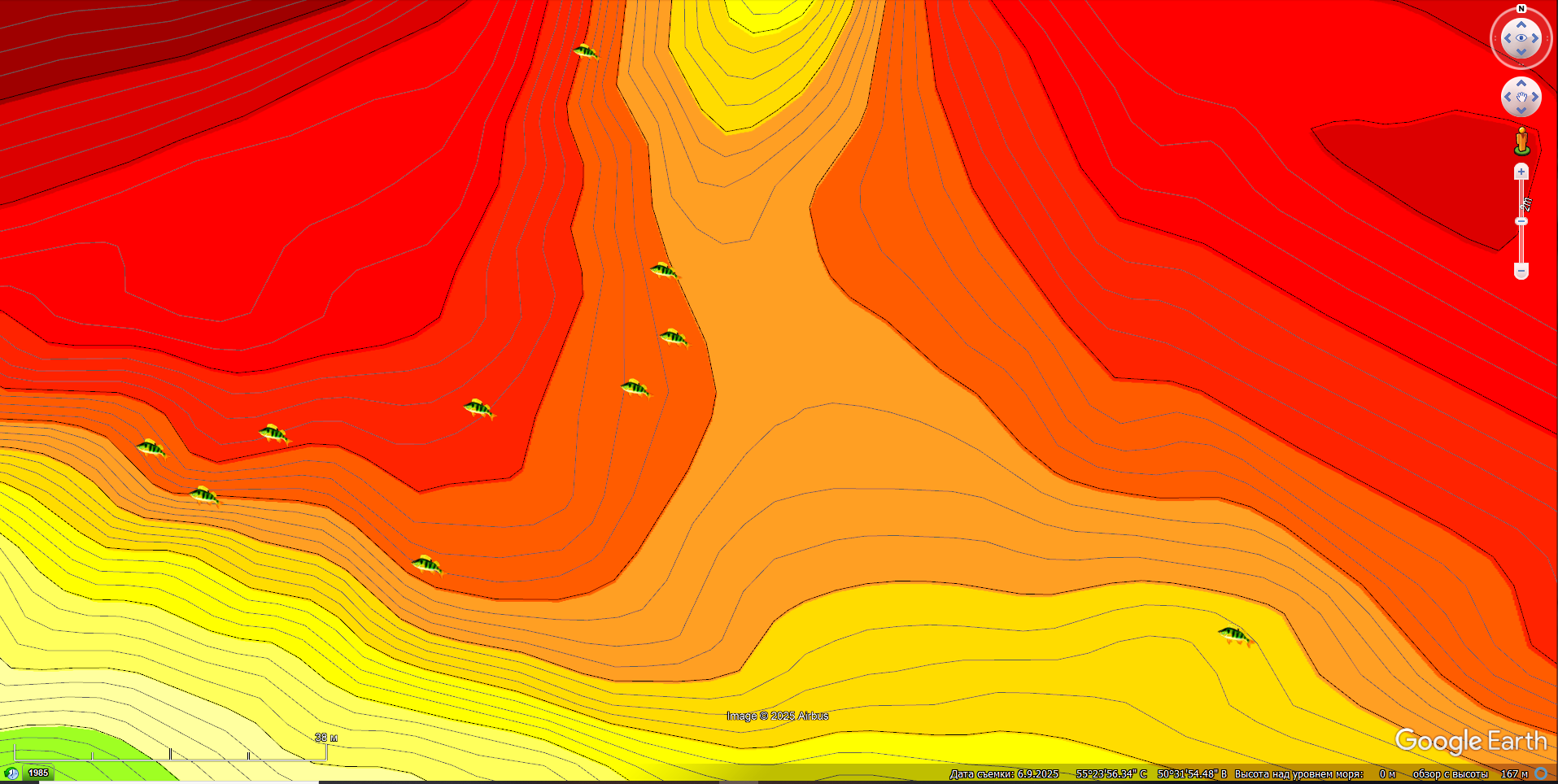 Иконку судака Андрея Тачанова (царствие небесное и вечная память) сделал тёмного цвета. Когда-то мне Андрей рассказывал, что на Каме его бывало «оббуривали» рыбаки, когда он начинал ловить судака — и только «раскодировав» все точки нашёл теперь подтверждение этому. Назову эти скрины в двух разных точках акватории Камы так: