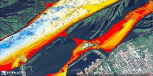 2) 7 февраля — сгенерировал Рифмастером батиметрическую карту 2018 г. в форматах KMZ и AT5 с учётом береговых линий русла Камы и островов. Её особенности — ВПЕРВЫЕ каждому полигону с шагом 1 метр присвоен свой цвет (0-1, 1-2, 2-3, 3-4 и т.д. — всего получилось 32 полигона), дополнительные изобаты с шагом 0,25 м не стал делать:
