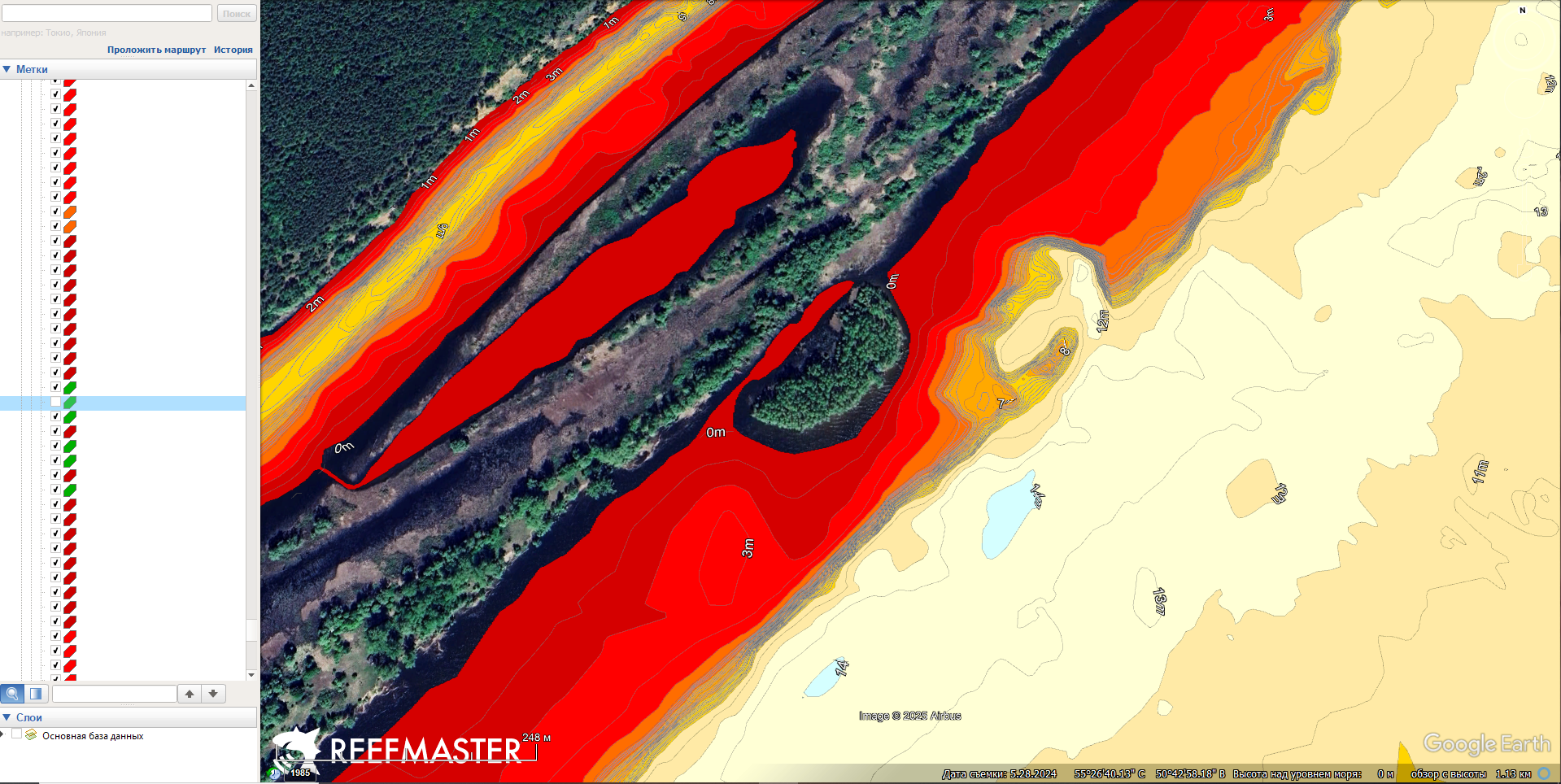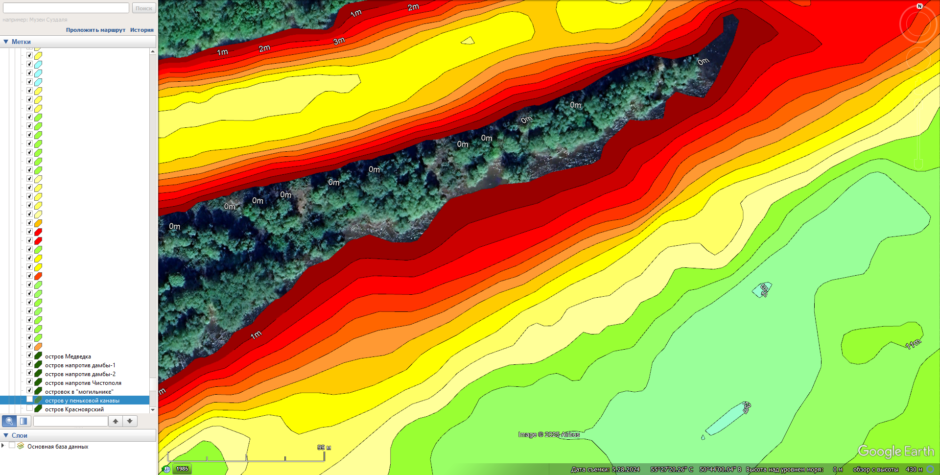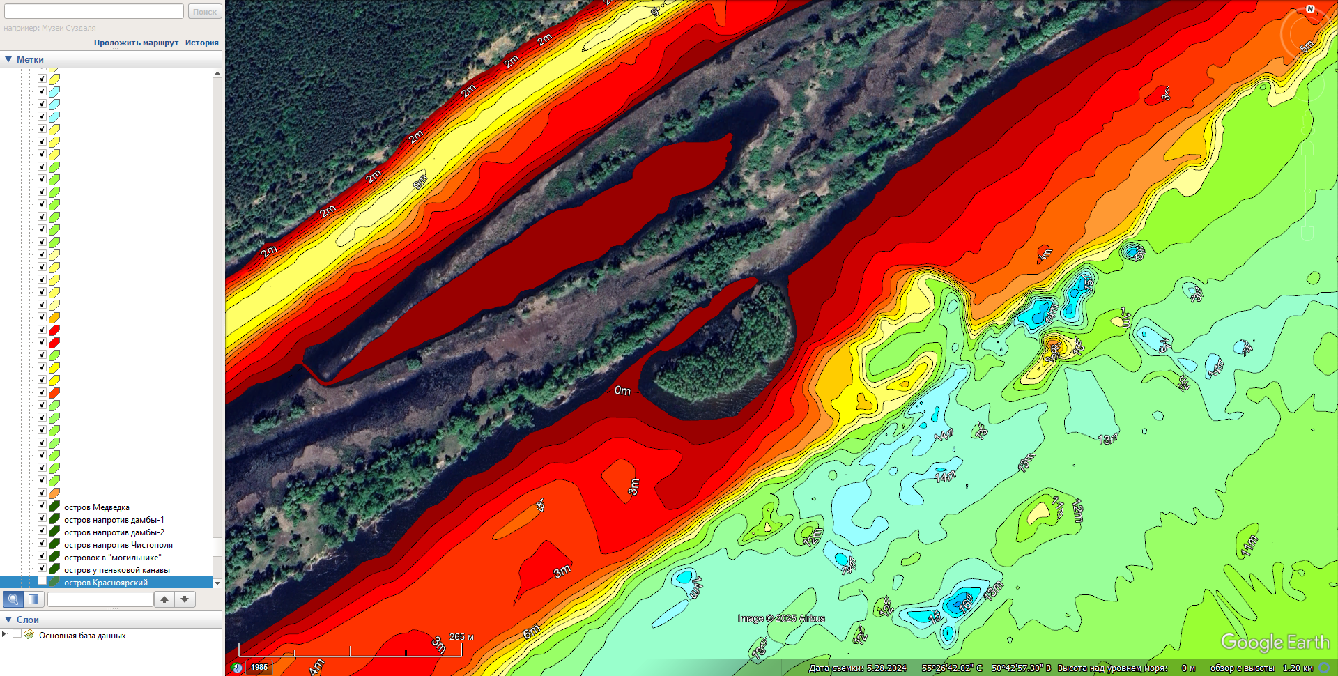 7) 23 декабря — полностью отредактированная от Вандовки до Сакон батиметрическая карта 2017 г. была готова! Ниже скрины у Красноярского острова в Гугл Планете Земля и в Альпине: