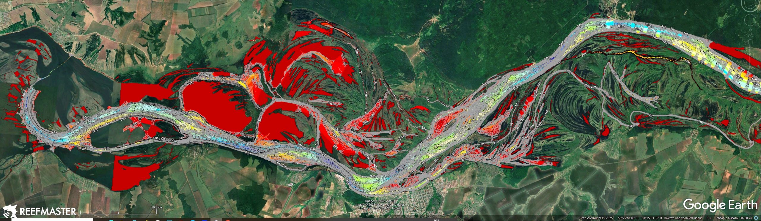 5) 18 ноября — сгенерировал Рифмастером батиметрическую карту после сезона 2019 г. в форматах KMZ и AT5 с учётом береговых линий русла Камы и островов. Её особенности — каждому полигону с шагом 1 метр присвоен свой цвет (0-1, 1-2, 2-3, 3-4 и т.д. — всего получилось 32 полигона), сделаны дополнительные изобаты с шагом 0,25 м. С 19 ноября по 20 января 2020 г. занимался её редактированием: